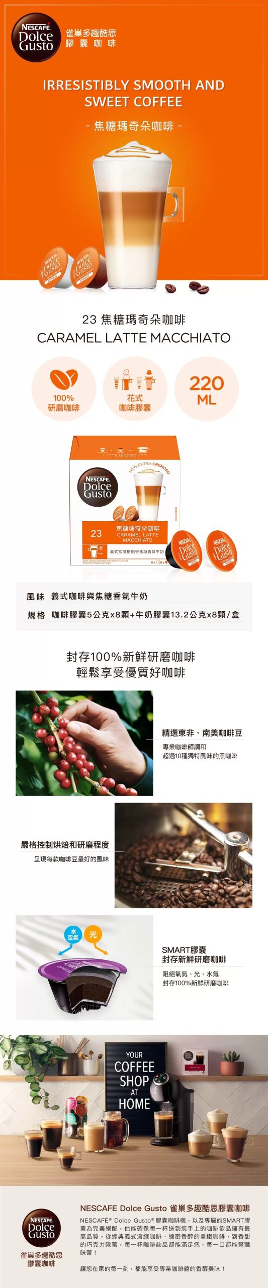 焦糖瑪奇朵咖啡是由純粹優質的巴西和哥倫比亞阿拉比卡咖啡豆和濃烈的越南羅布斯塔咖啡豆混合而成。令人無法抗拒的焦糖瑪奇朵咖啡,焦糖香氣結合優質綜合咖啡豆,造就香氣撲鼻的迷人滋味。